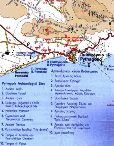 Early-Geometric and Geometric Age remains of habitation, mainly tombs, have been found in the area of the ancient Agora and throughout the city. Tombs and graves, which have recently been excavated by M. Viglaki in the area of the ancient Gymnasium, present great interest. The fact that these tombs most probably remained visible, and were respected within the boundaries of the city, until the construction of the Gymnasium-Palestra (wrestling) complex, following the return of the exiled inhabitants of Samos (322 BC.), possibly indicates an ancestor-worship connected to the race of the “Geomores”, the former owners of the land – the first Ionian settlers. The great technical works from the heyday of Samos, which Herodotus refers to with such admiration, are preserved to this day: The great temple of the goddess Hera, The ‘Amfistomou Orygma” (Two-entranced Tunnel), better known as The Tunnel of Efpalinos and the “Choma en thalassii” (the ancient pier of Pythagorion), are the great works of ancient Samos. Alongside these great accomplishments of antiquity are the impressive city walls, which are directly connected to them. On the map you can see the ancient city of Pythagorion. In the annotation the archeological sites have been marked.